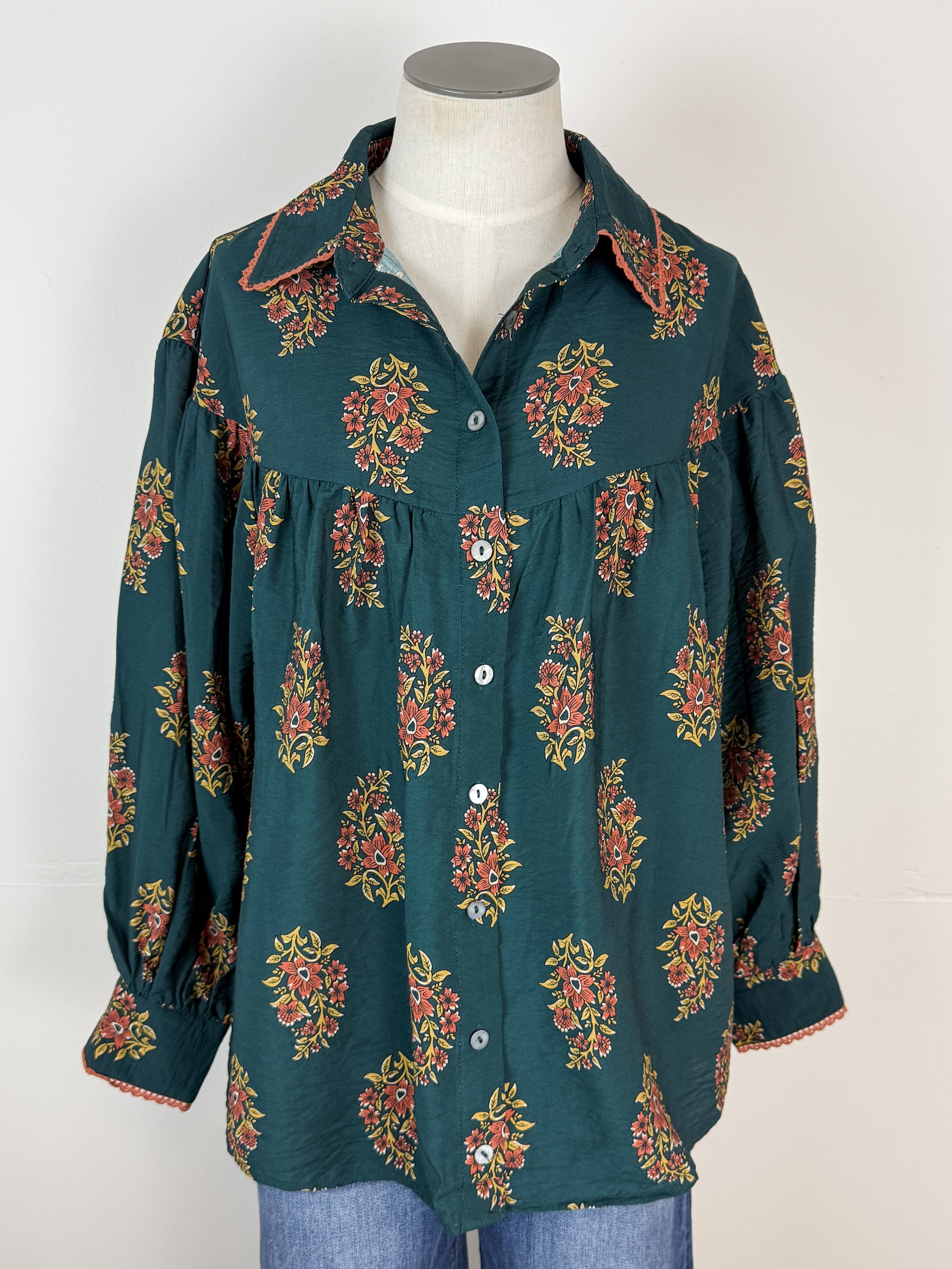 The Abigail Blouse in Dark Green is a printed, collared button-up with an effortlessly flowy fit. Cute and versatile, it's the perfect piece for creating polished looks that feel comfortable and put-together.