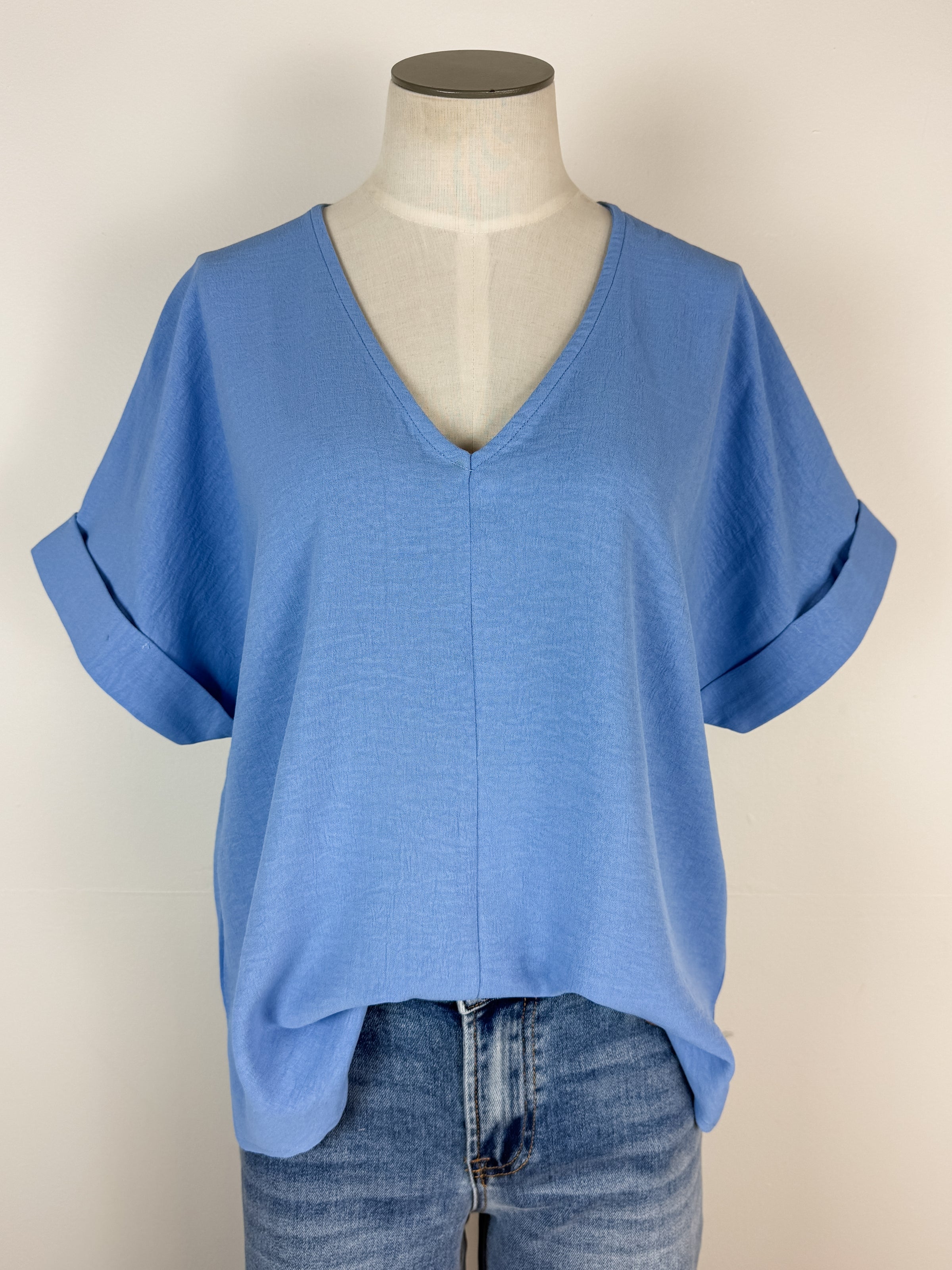 The Charlotte Basic V Neck Blouse in Sky delivers timeless elegance in a versatile package. Its flattering v-neckline, rolled short sleeves, and relaxed loose fit make it the perfect layering piece or standalone essential. Effortlessly chic and endlessly wearable, this sky-blue blouse transitions seamlessly from work to weekend.