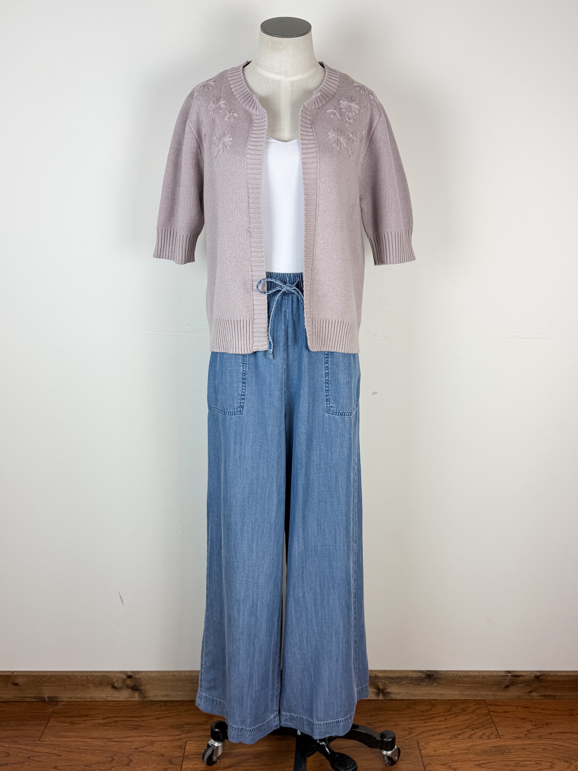 This charming lilac cardigan features delicate daisy embroidery and a relaxed open front. Short sleeves, round neckline, and ribbed edges create an effortlessly polished look. Above-the-hip length makes it perfect for layering over anything in your closet.