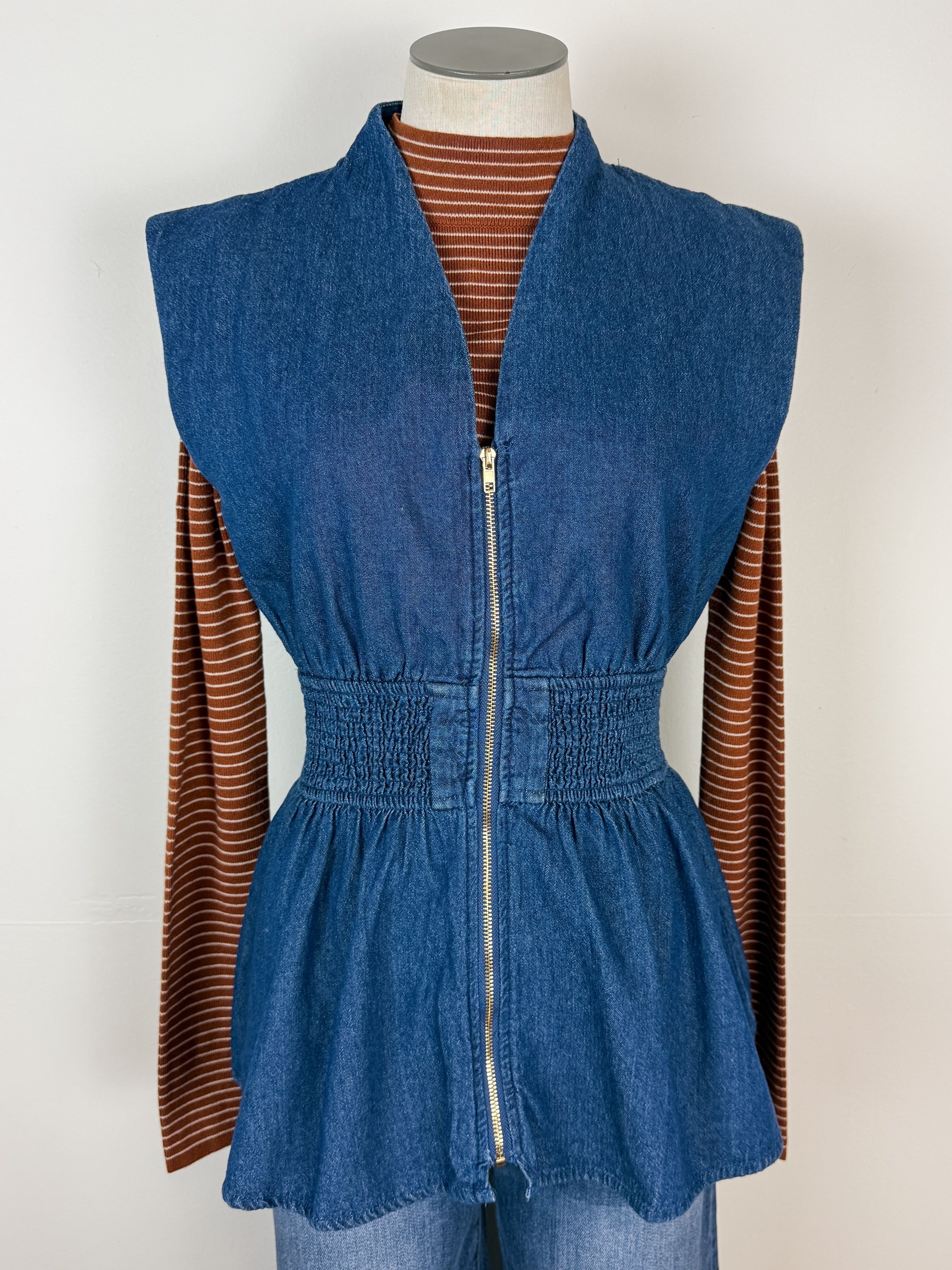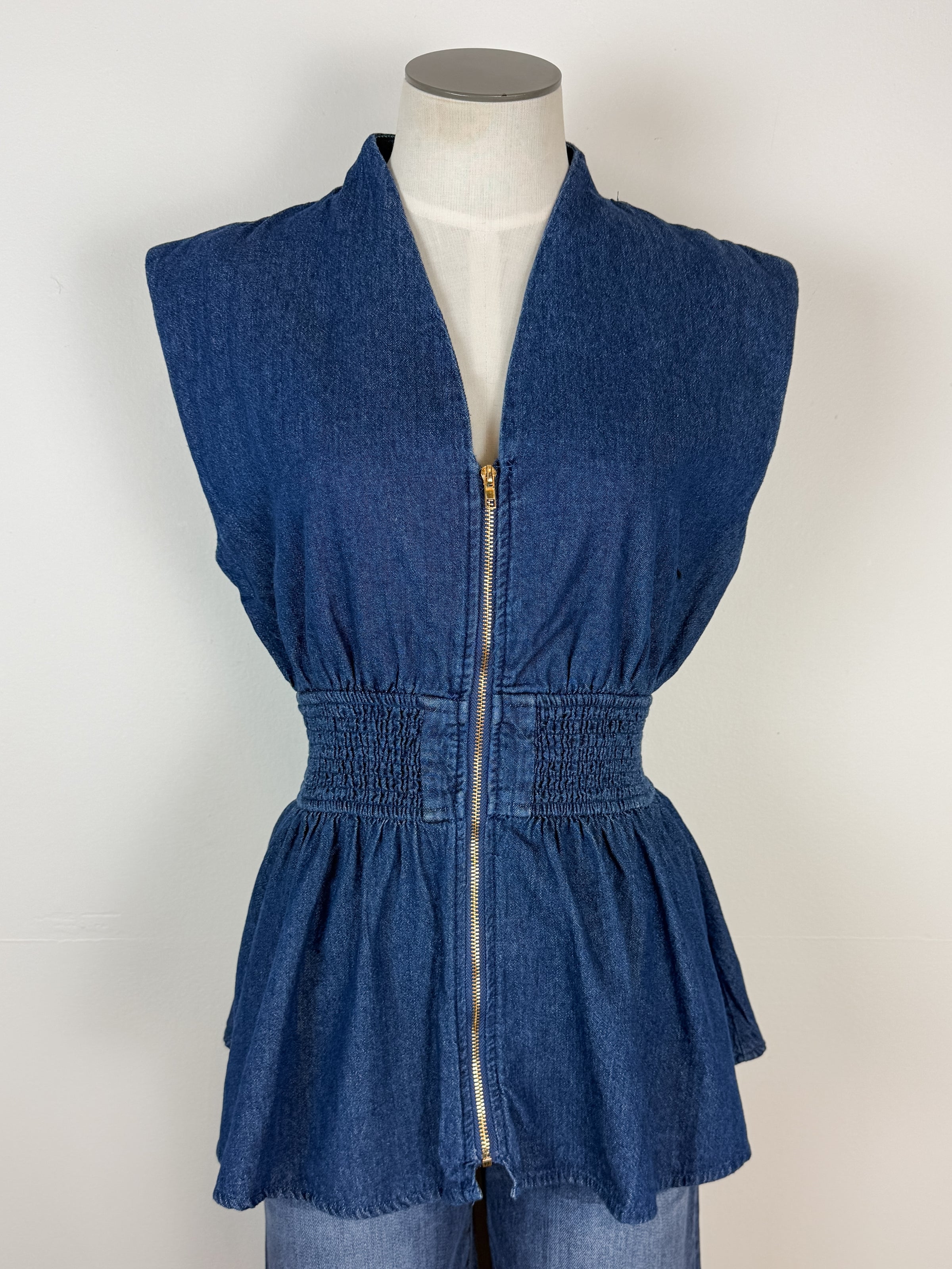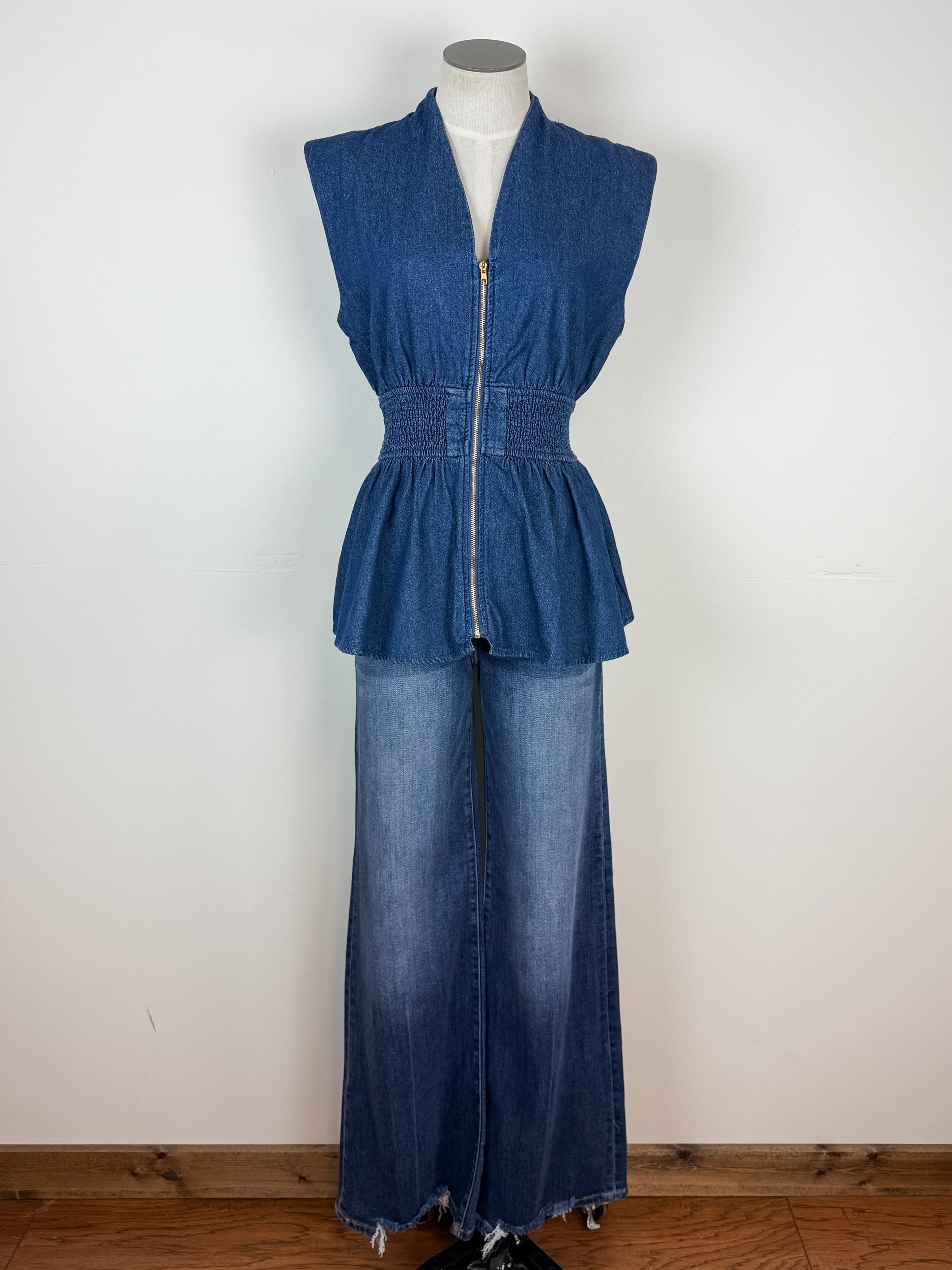Elevate your layering game with the Gianna Zip Up Denim Top in Dark. This sleeveless essential features a flattering cinched waist that defines your silhouette while the front zip closure offers easy styling versatility. Pair it effortlessly over your favorite sweater for a chic, dimension-adding look, or wear it solo during warmer months. The timeless dark denim construction ensures it'll become a go-to piece in your wardrobe for seasons to come.
