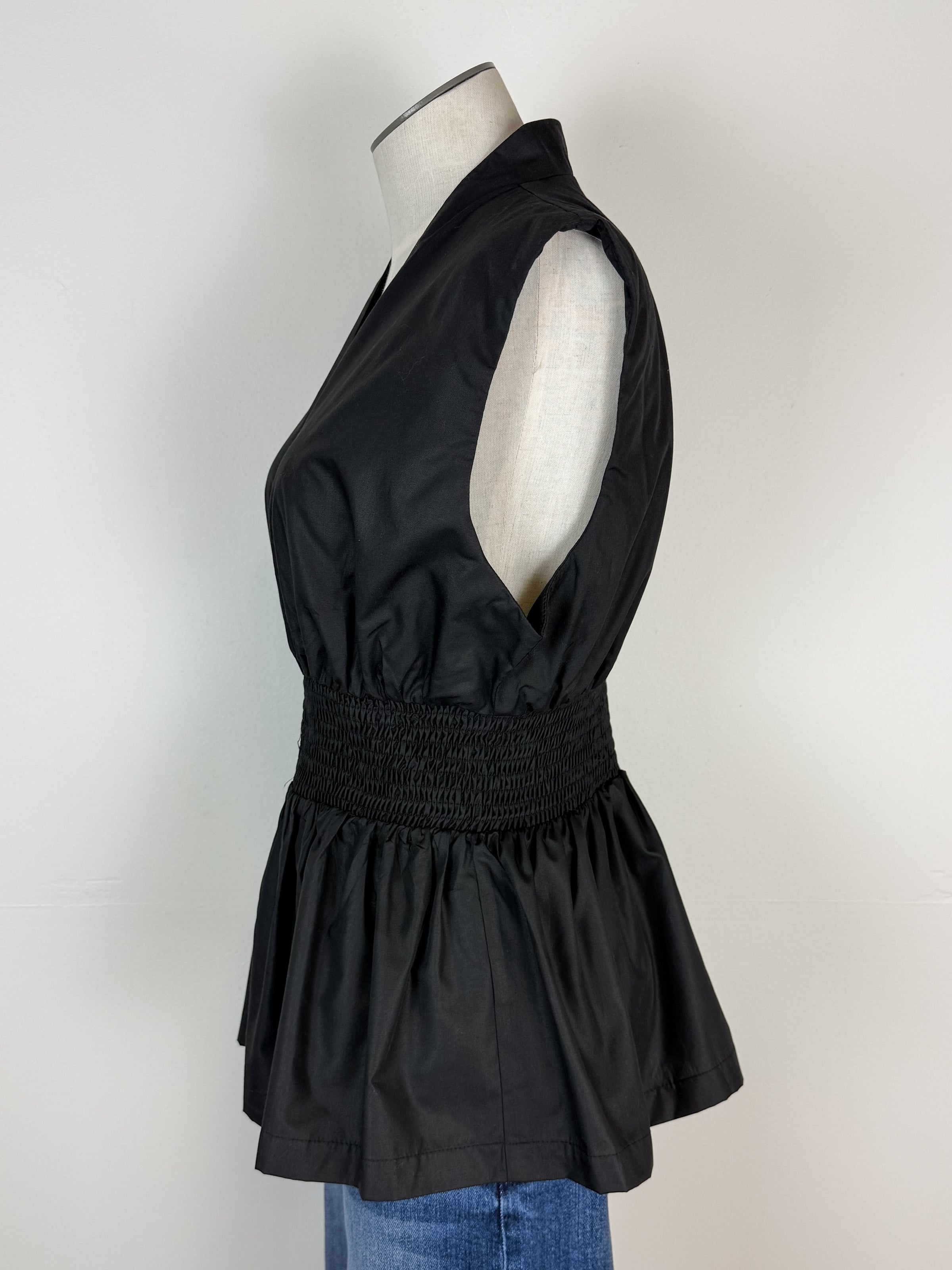 The Kora Zip Up Sleeveless Blouse in Black features a flattering peplum design and convenient zip closure, making it a cute and versatile blouse for effortless style.