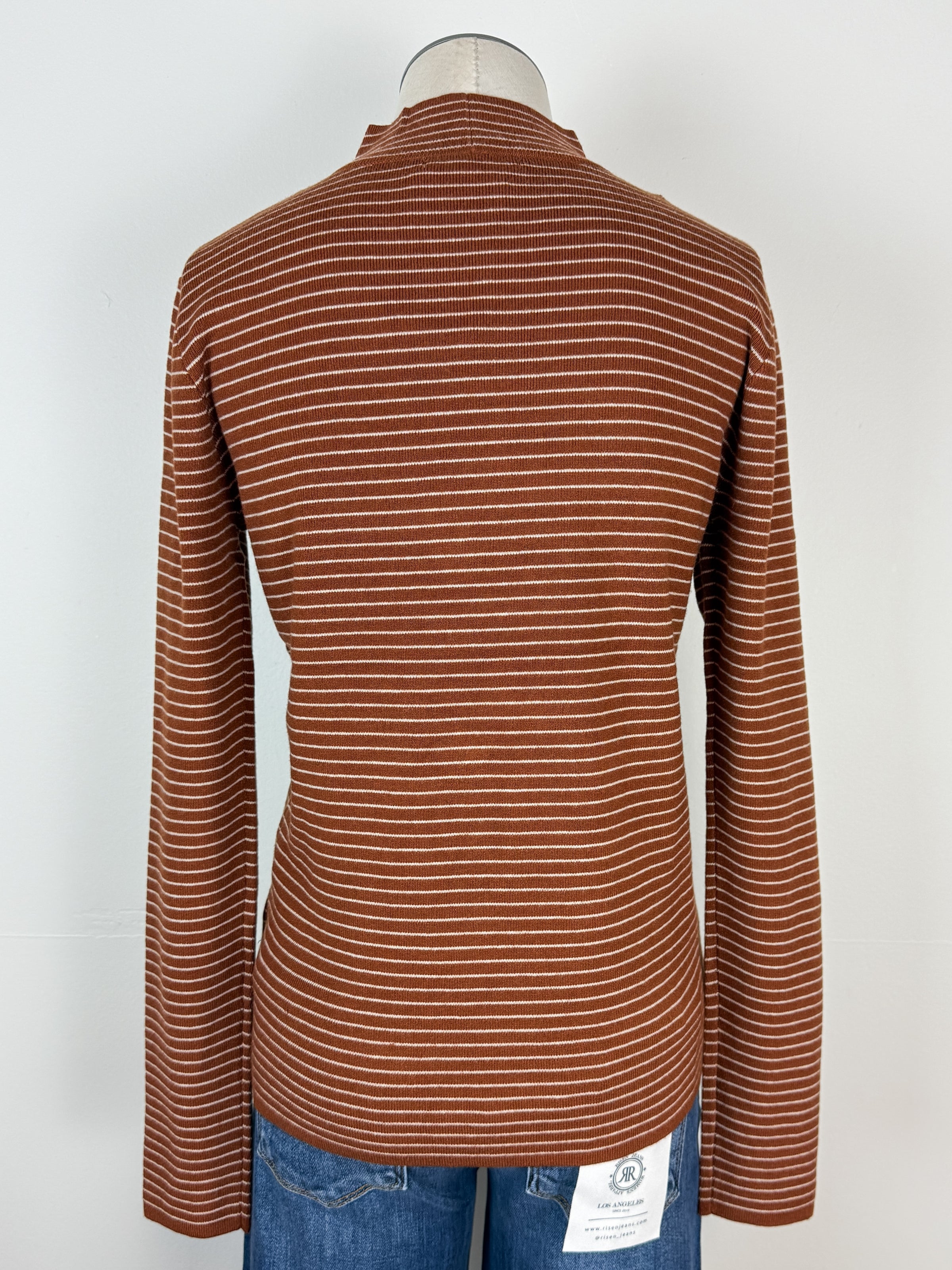 Elevate your everyday wardrobe with the Maria Pinstriped Mock Neck Sweater in Copper. This adorable knit features classic pinstripes and a flattering mock neck. Crafted for comfort, it's the perfect layering piece that transitions seamlessly from casual days to polished evenings. Whether worn solo or styled, this sweater delivers both style and coziness you'll reach for again and again.