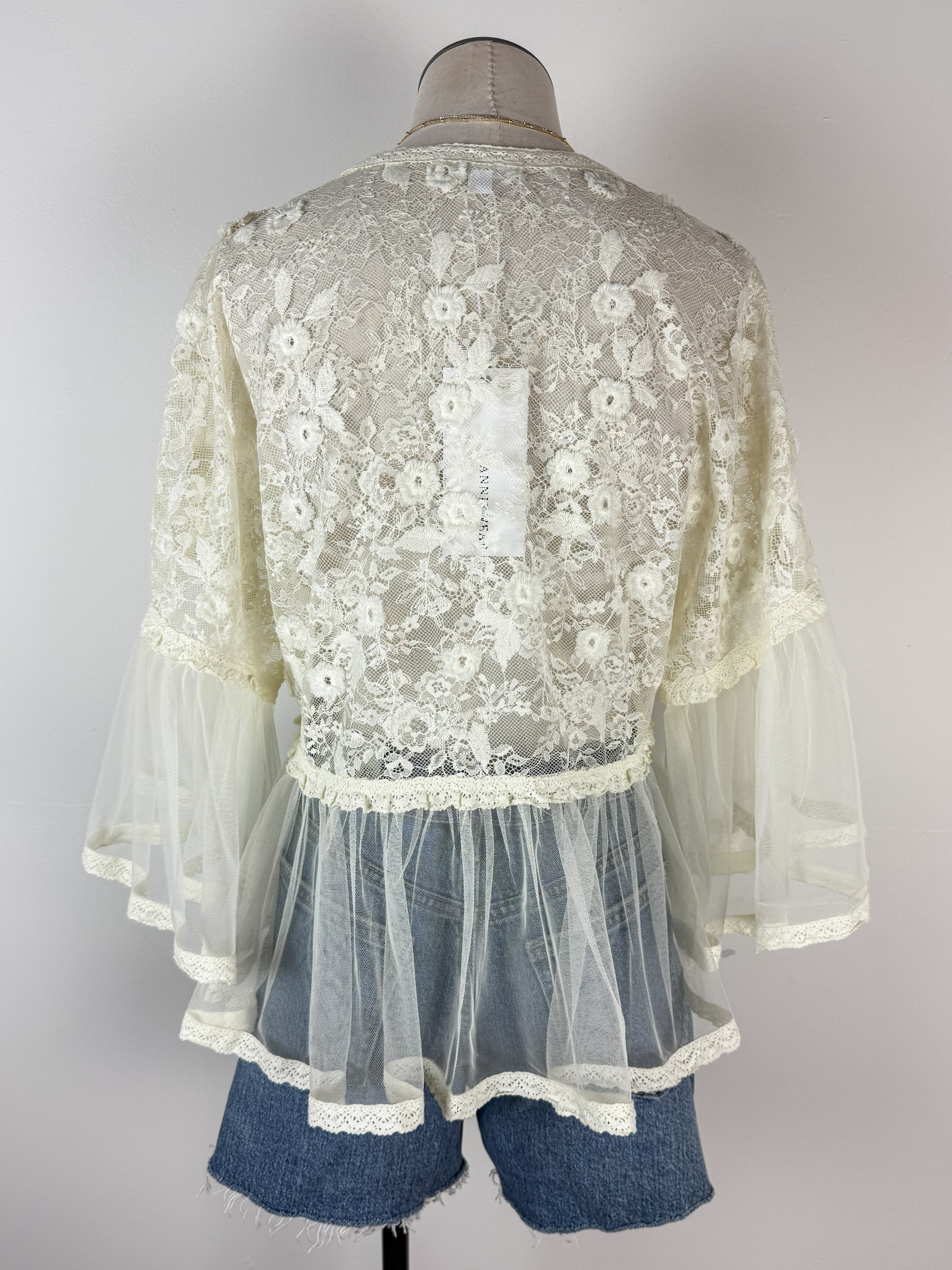 Effortless elegance meets romantic style with the Nyla Lace Flowy Blouse. Crafted in soft ecru, this sheer beauty features delicate lace detailing and bell sleeves. The flowing silhouette drapes gracefully, creating movement with every step. Perfect for layering or wearing solo, this pretty blouse pairs seamlessly with your favorite basics or dresses. Ideal for spring brunches, casual outings, or whenever you want to feel polished and feminine.