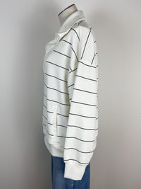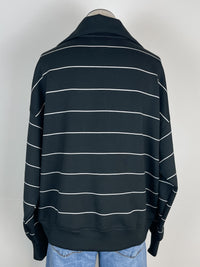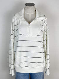 Enhance your wardrobe with the Emmy Striped Quarter Zip. Made with ultra-soft modal scuba material, this quarter zip offers both comfort and style. The collared design and front pocket add to its versatility, making it a must-have for any occasion. Embrace the classic yet modern look with its stylish stripes.