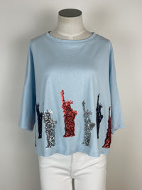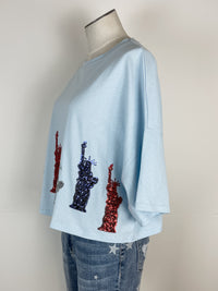 Ariel Statue of Liberty Sequin Tee in Baby Blue