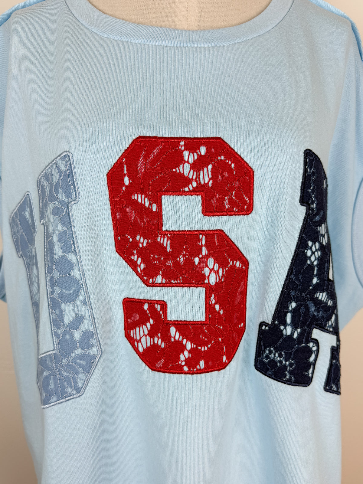 Show your patriotic spirit with the Nora Lace USA Oversized Tee in Light Blue. Its cute lace detail and relaxed boxy fit make it perfect for a stylish and comfortable 4th of July look.