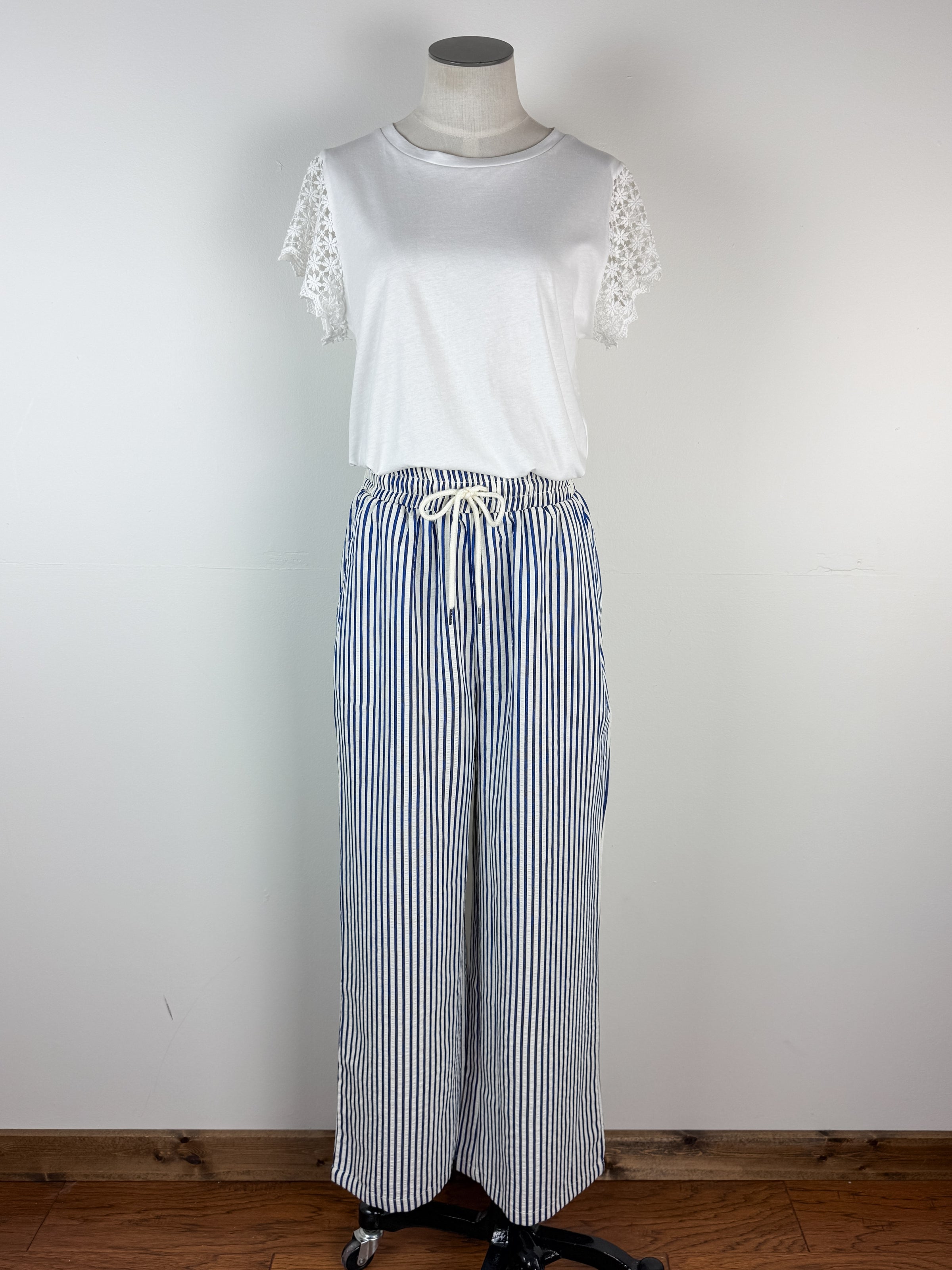 Effortless style meets everyday comfort in the Annie Striped Pant. Featuring classic stripes, these wide-leg pants offer a flattering silhouette that works for any occasion. Functional pockets and elastic waist with adjustable drawstring that ensures the perfect fit. Soft, breathable fabric makes them as cozy as your favorite loungewear—without sacrificing that polished, put-together look.