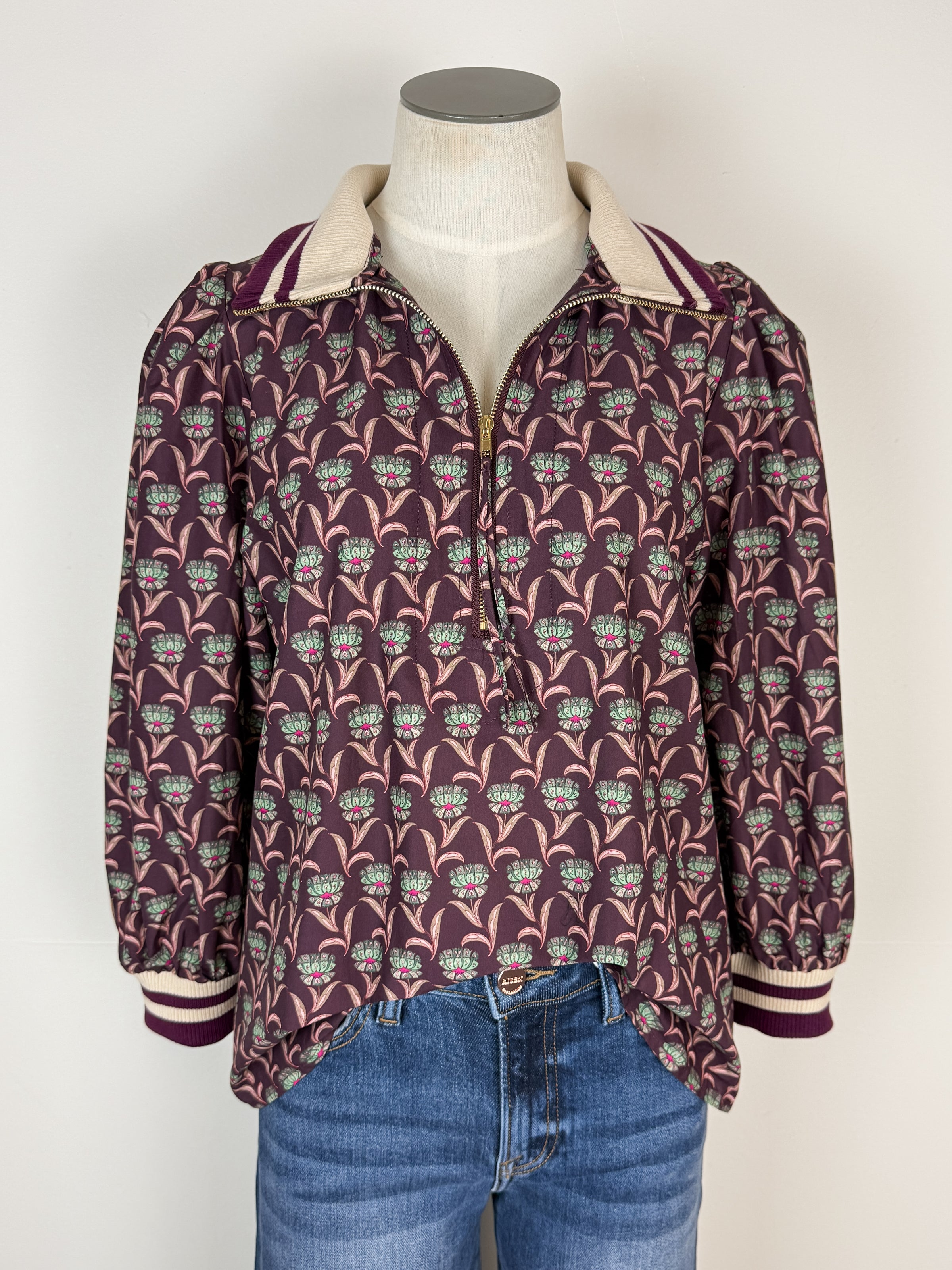 The Kiara 1/4 Zip Collared Blouse combines fun floral styling with practical design. Featuring 3/4 puff sleeves, a convenient quarter-zip front, and contrast ribbed collar and cuffs, this merlot top delivers both elegance and versatility for any occasion.