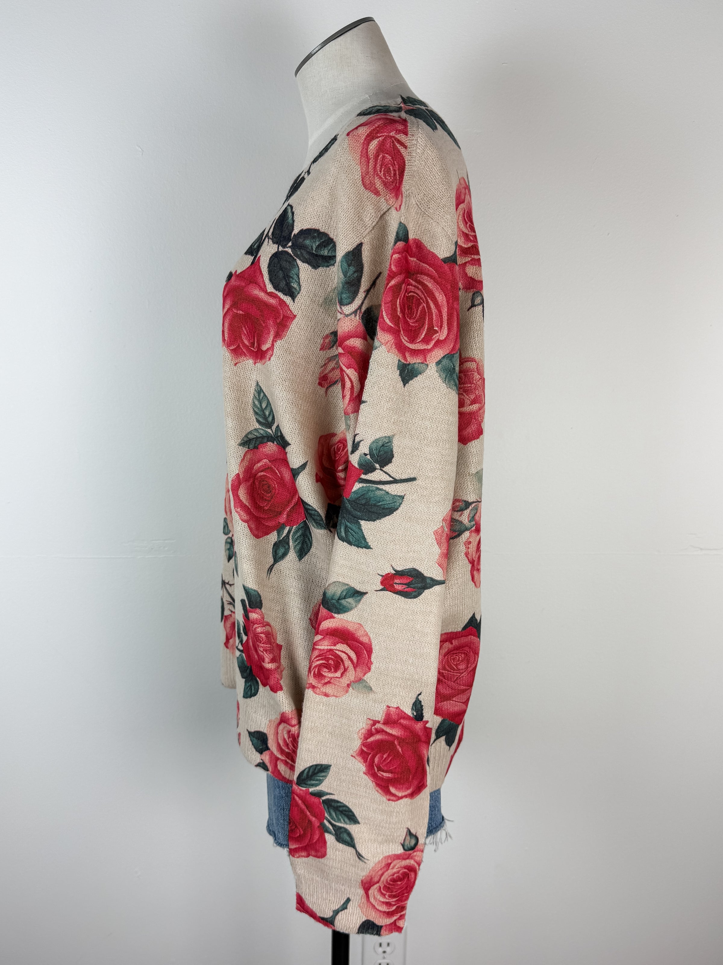 Cute and charming, the Cassie Rose Sweater features an adorable rose print on lightweight knit. Long sleeves, soft oatmeal tone, pairs with everything.