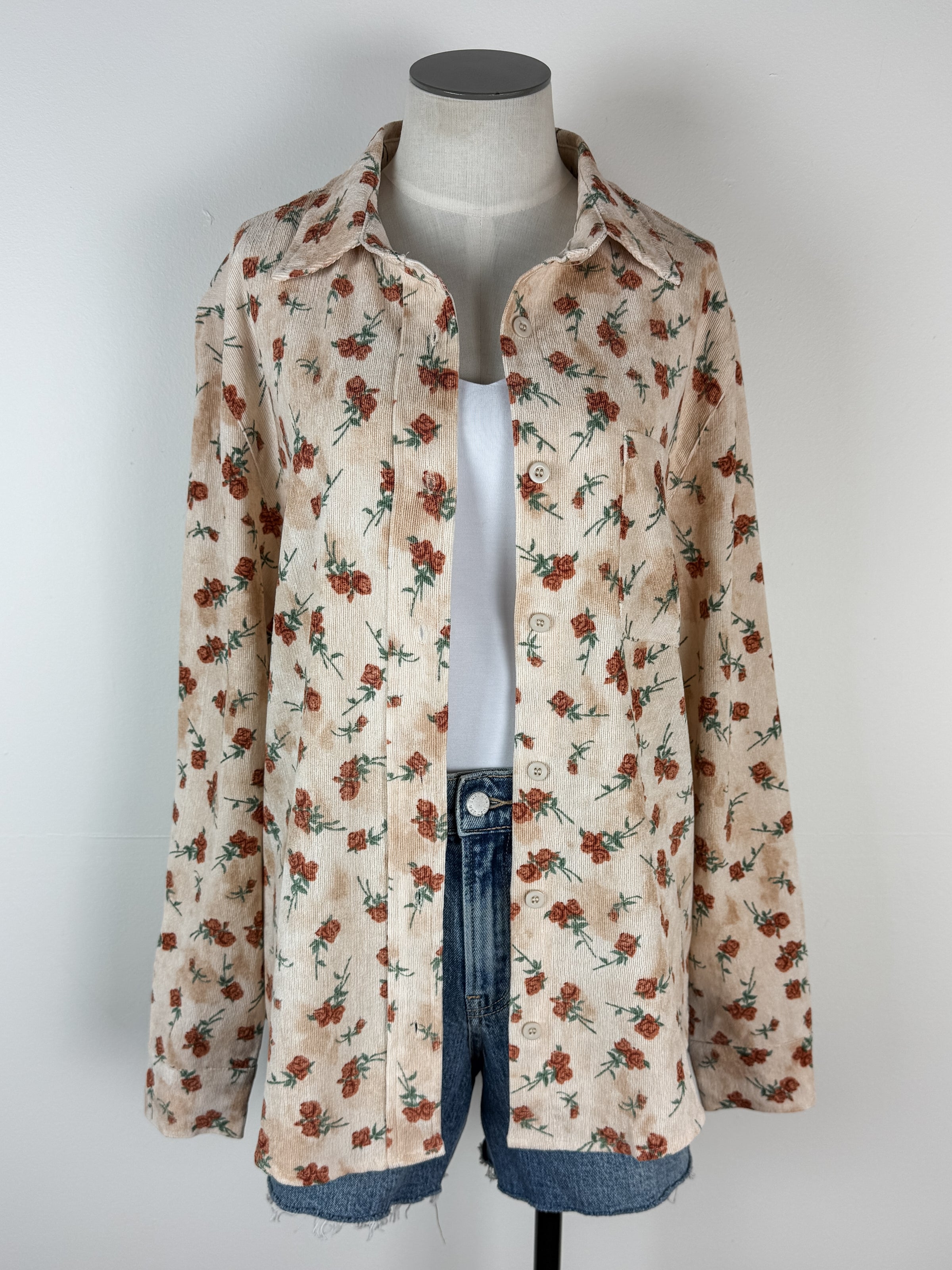 Soft corduroy button up with a delicate floral print in cream and rust. Wear it solo or layer it over a tee for effortless style. The relaxed fit works for casual days and polished looks alike.